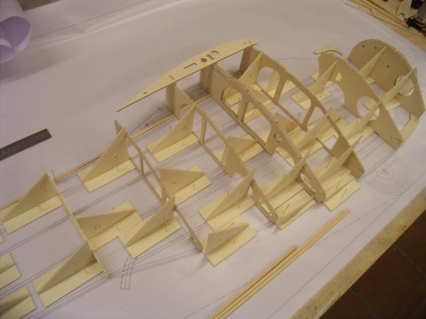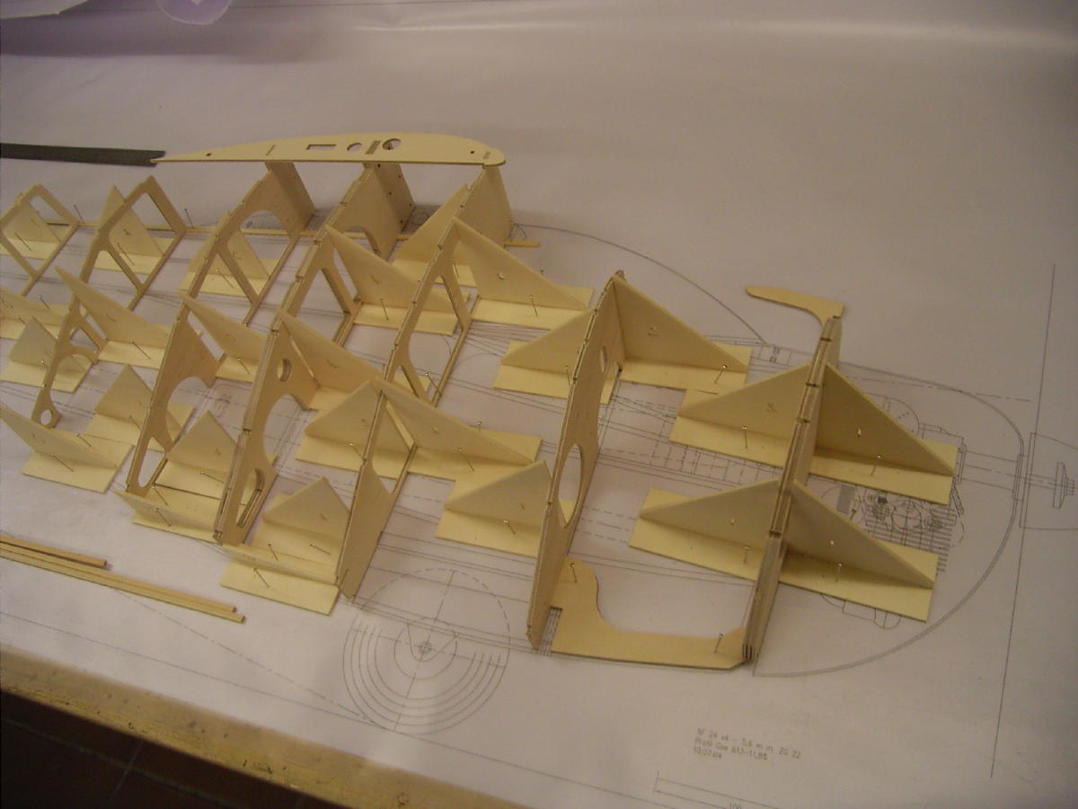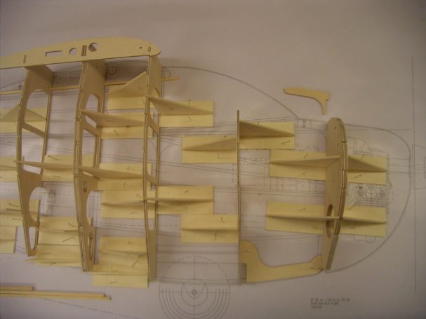 Erstklassig CAD Gezeichnete Baupläne sowie eine Stückliste und die Numerierten Bauteile runden diesen Bausatz ab. Für den Rumpf, der in Halbschalenbauweise aufgebaut wird, werden Hellingswinkel im CNC-gefrästen Stecksystem mitgeliefert. Sie benötigen nur ein grosses ebenes Baubrett und ein gutes gelingen des Rohbaus ist garantiert.
